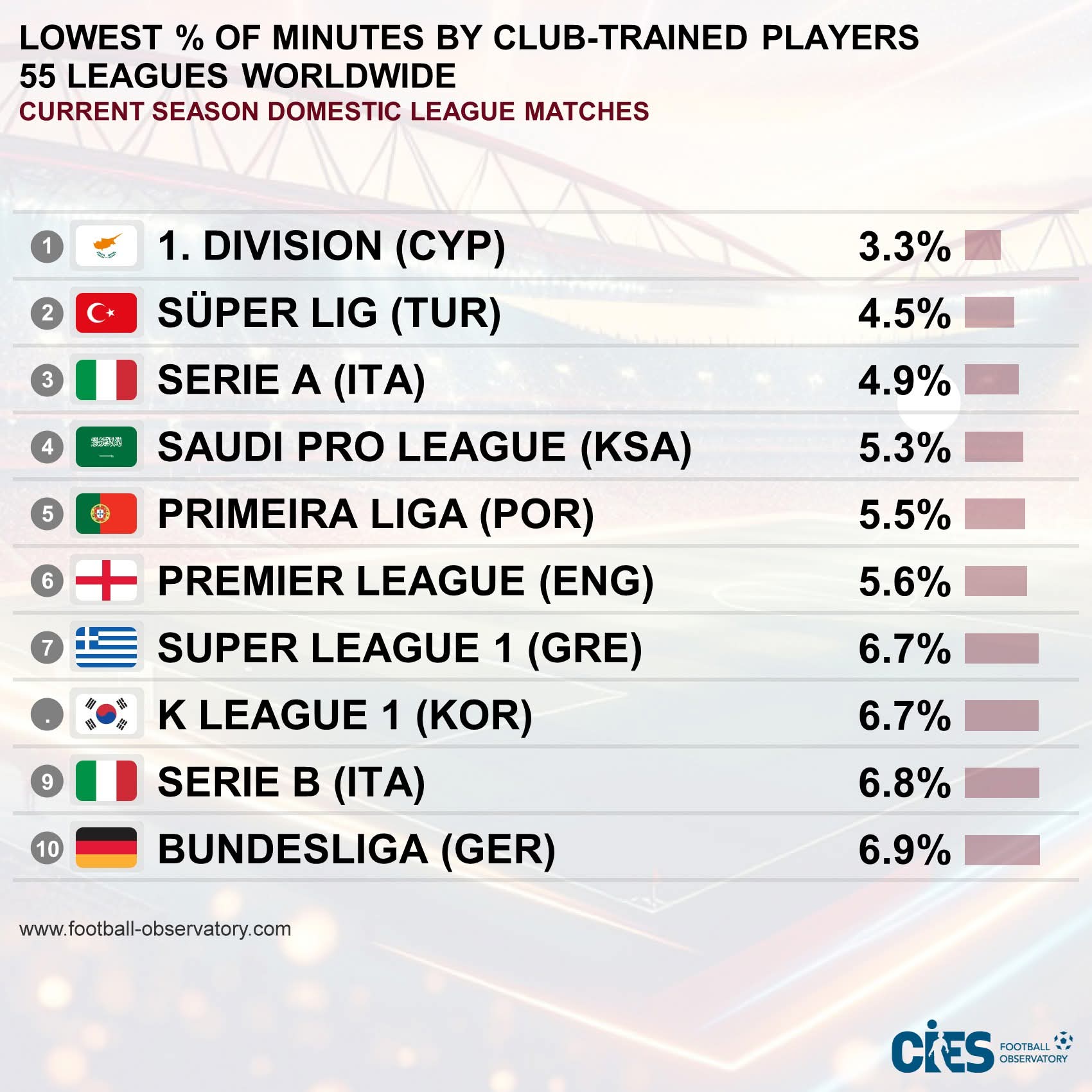 Η έκθεση “Demographic profiling of players, clubs and leagues across Europe” του CIES αποκαλύπτει ότι το ποσοστό των λεπτών συμμετοχής στο πρωτάθλημα που καλύπτονται από παίκτες «club-trained» στην Κύπρο είναι εξαιρετικά χαμηλό, ανάμεσα στους χαμηλότερους σε όλη την Ευρώπη.