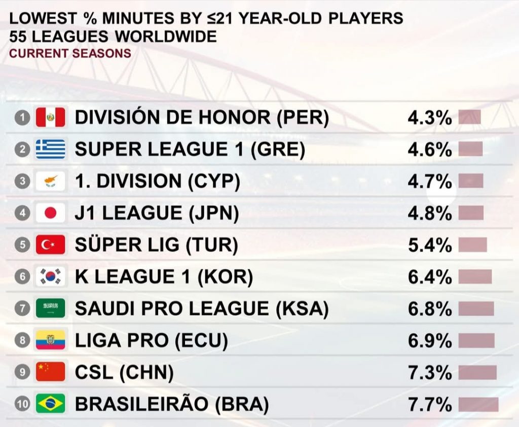 Αυτό το επίπεδο ένταξης θεωρείται πολύ χαμηλό σε σχέση με πρωταθλήματα, όπου οι ομάδες επενδύουν πιο ενεργά σε νέους.